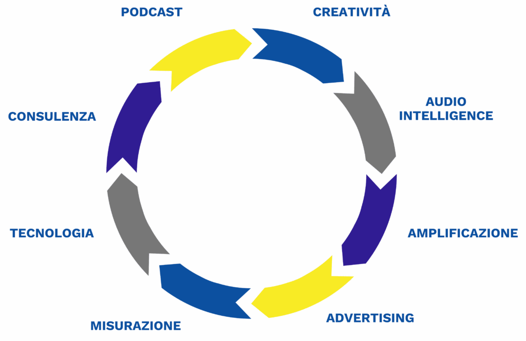 Gestiamo tutti gli elementi che compongono quello che è un vero e proprio progetto di comunicazione in audio, con i suoi specifici obiettivi, attività, strumenti e metriche di misurazione.